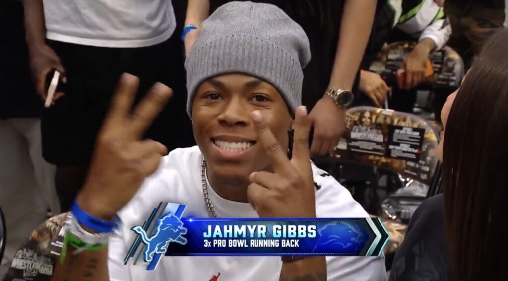 Detroit Lions running back Jahmyr Gibbs made an appearance on one of the biggest stages in sports entertainment Saturday night at WrestleMania Night One in Las Vegas.