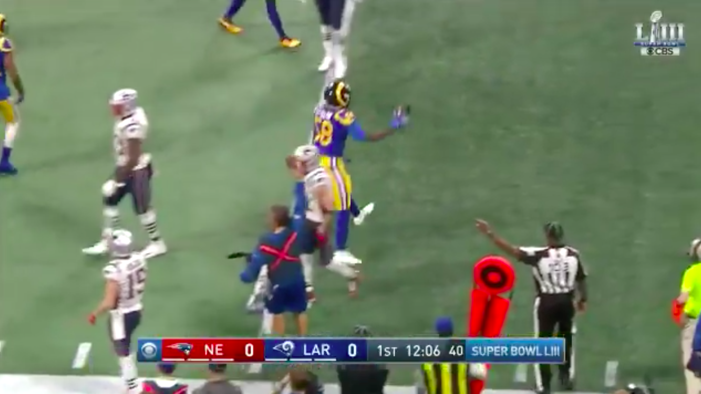 The Patriots were driving on their first possession of Super Bowl LIII and had the Rams firmly on their heels as New England moved into field goal position.
