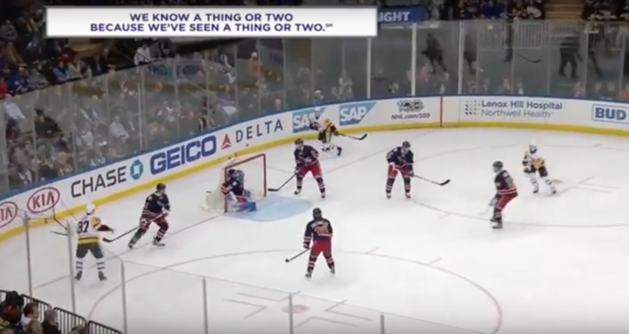 Love him or hate him, Sidney Crosby is still probably the best player in the NHL which is illustrated from the needle he had to thread to score on Henrik Lundqvist from behind the red line tonight. Seriously, how do you defend the net against something like this? Answer, you really don’t.